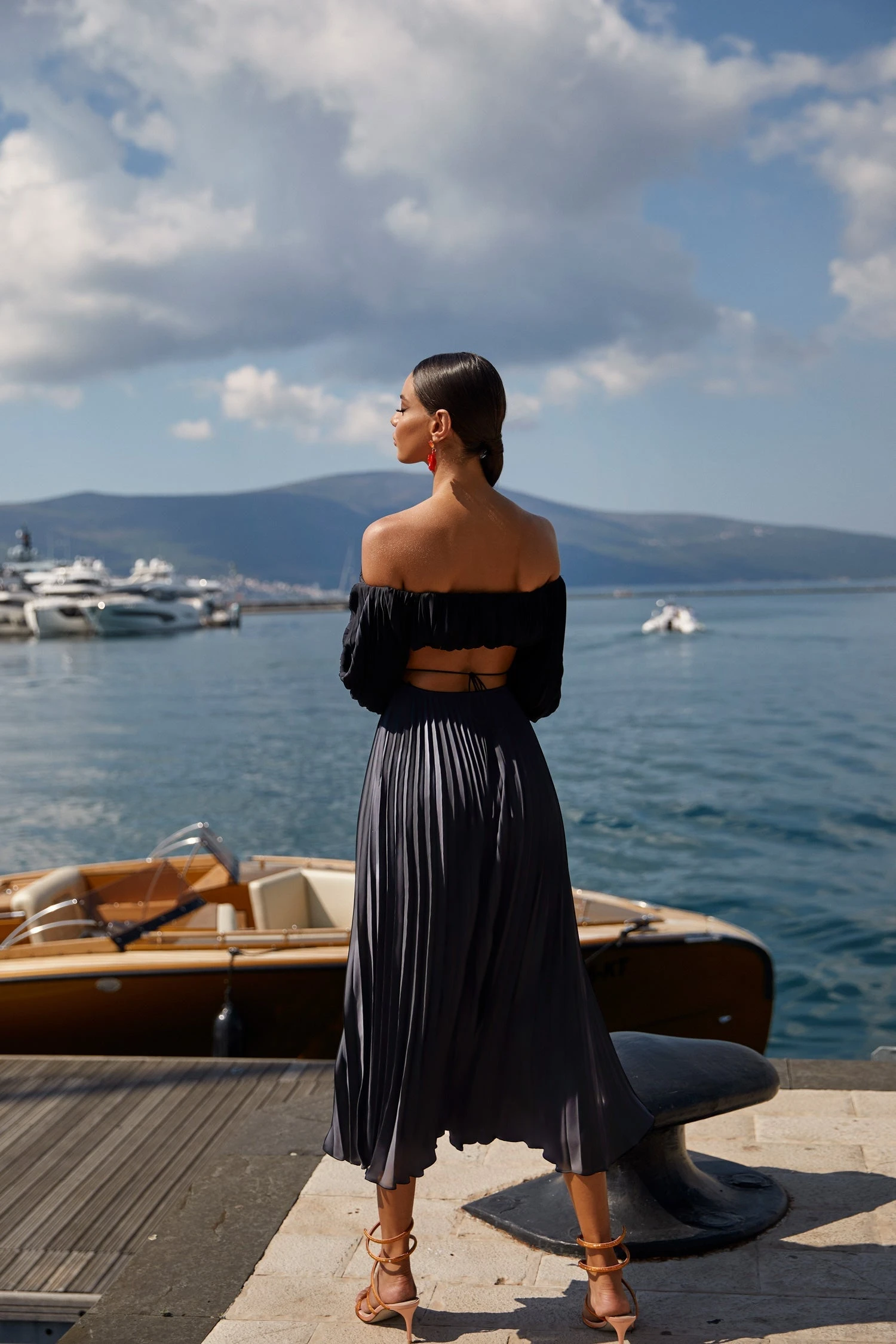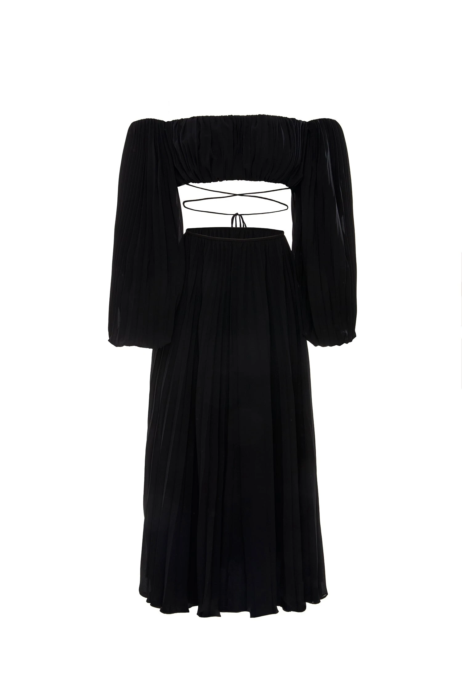 The Angelina Set embodies elevated resort wear with its pleated satin fabrication, criss-cross waist tie, and off-shoulder blouson sleeves. Separated at the waist, this skirt features a side slit and free-falling silhouette that sways with each step.