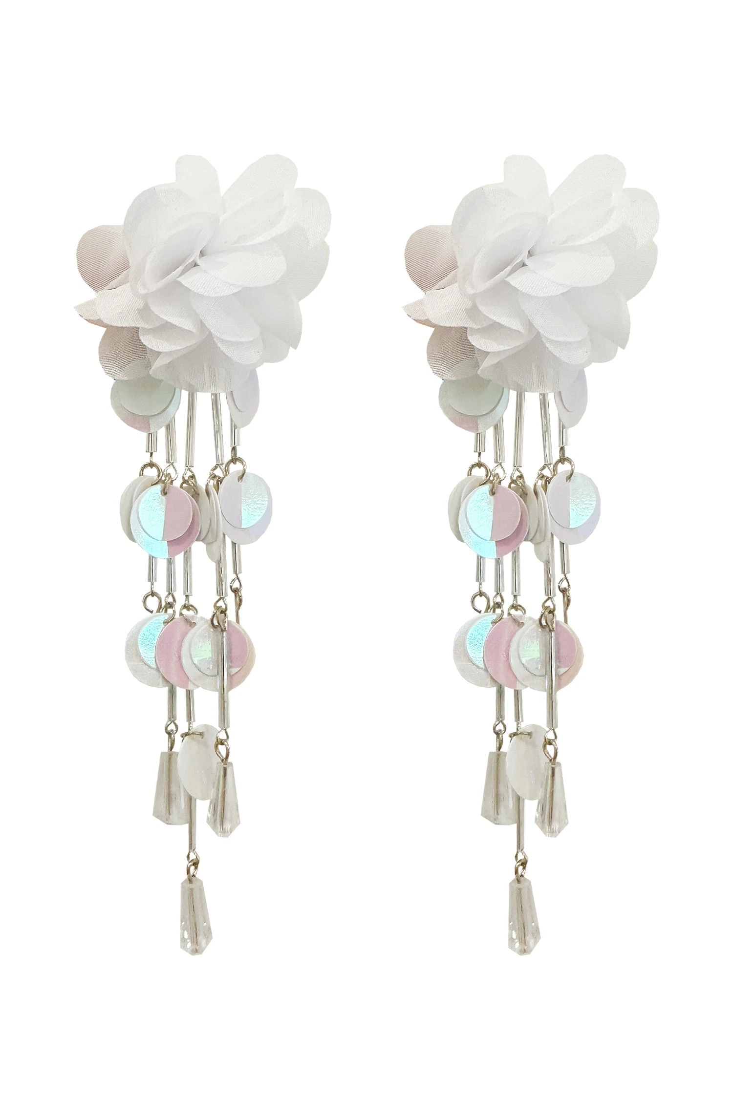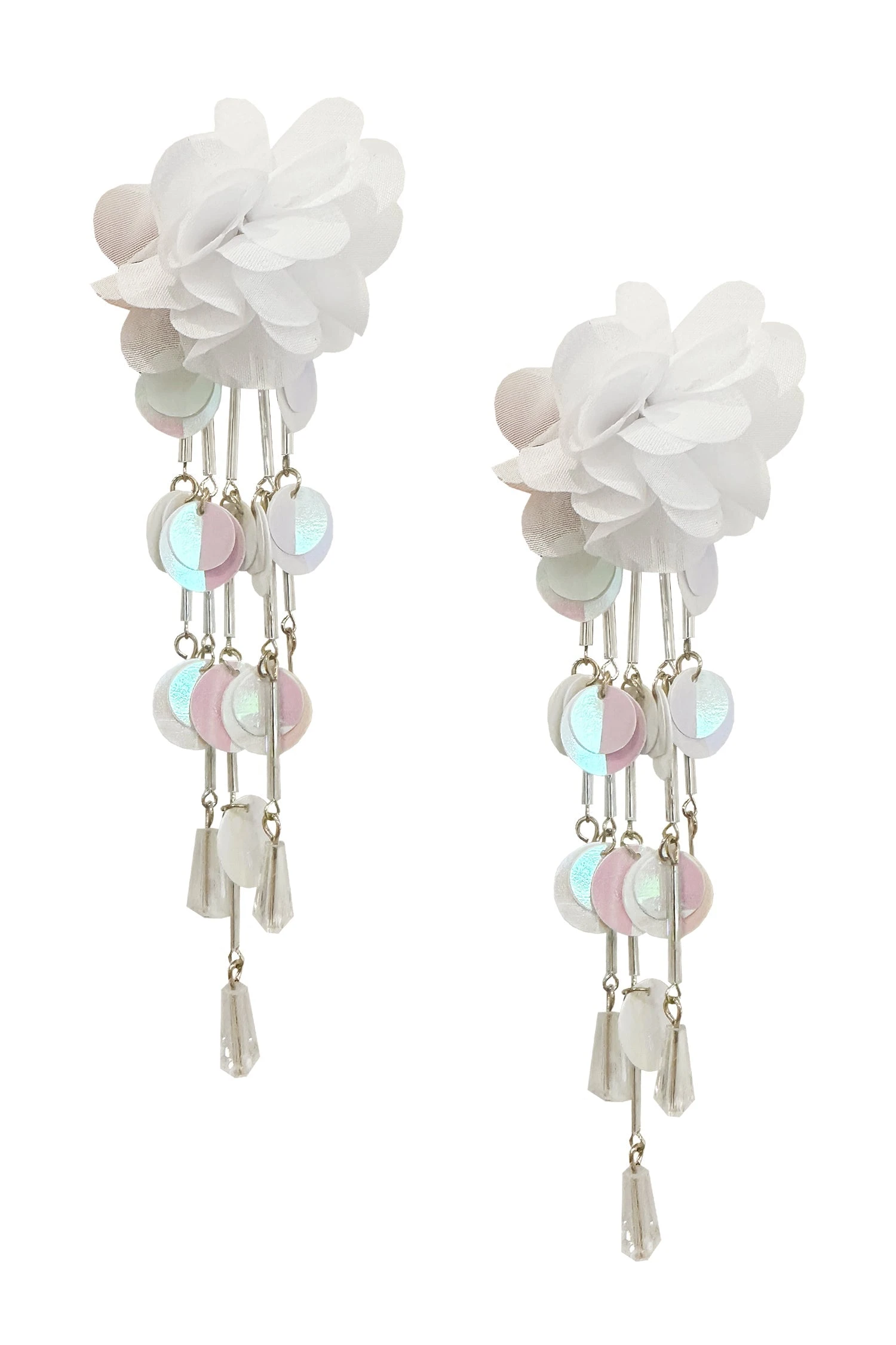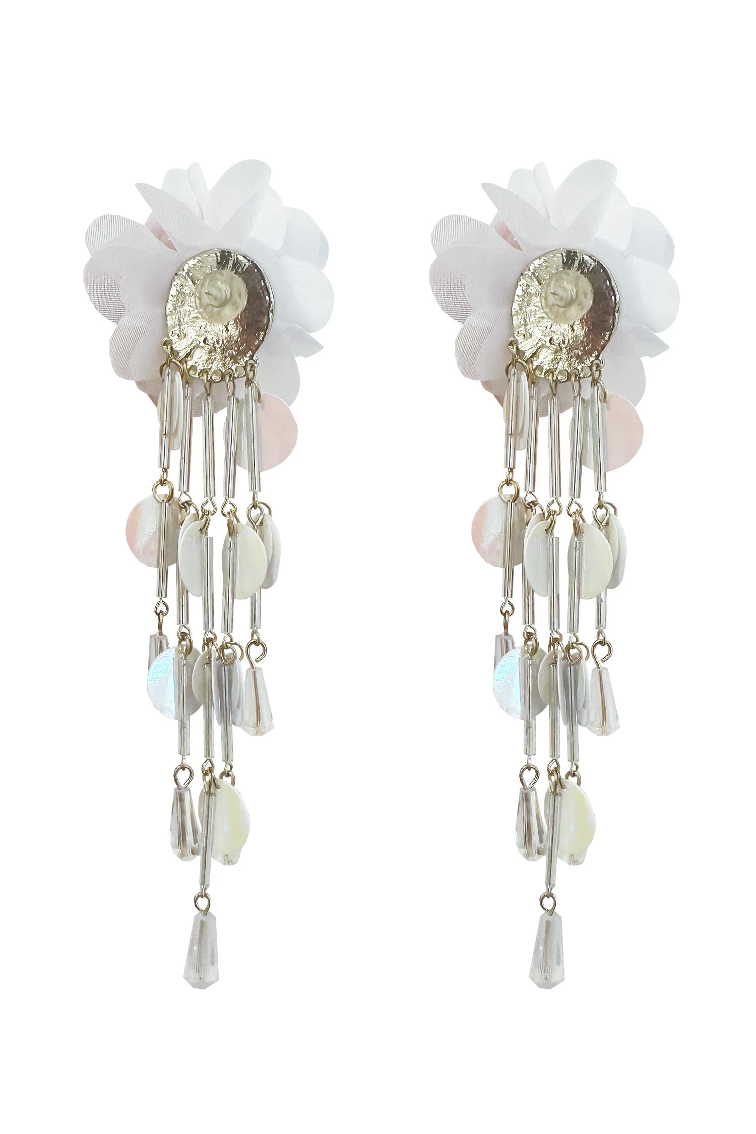 The Anita White Earrings are one of many new additions to our earring collection. Embellished with mini iridescent sequins and beads and statement flowers, these earrings will be sure to make a statement.Â