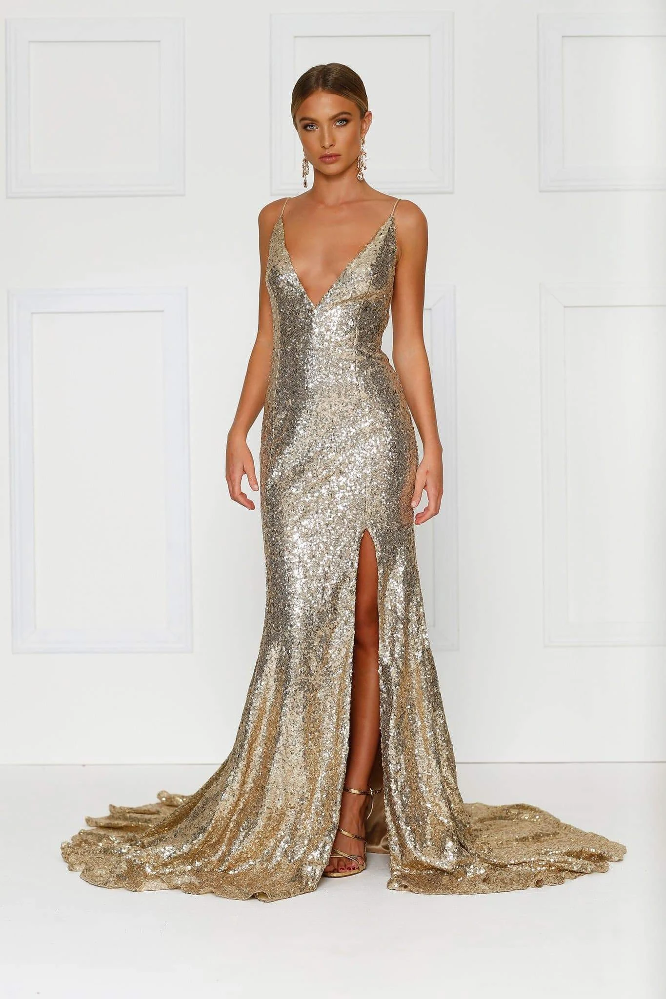 Armanah gown is embellished with sequins, this gown reflects serious glow in the sunlight. Featuring a deep neckline with a low open back. An elegant side slit and a massive train to turn heads.