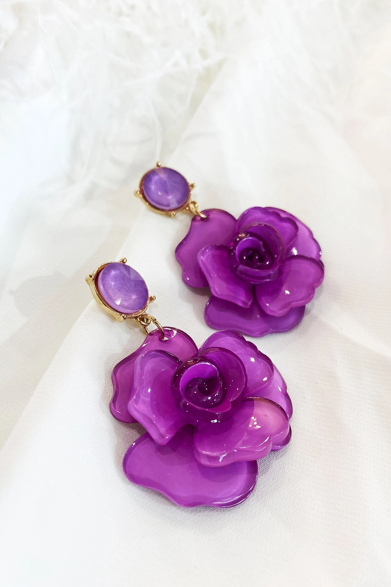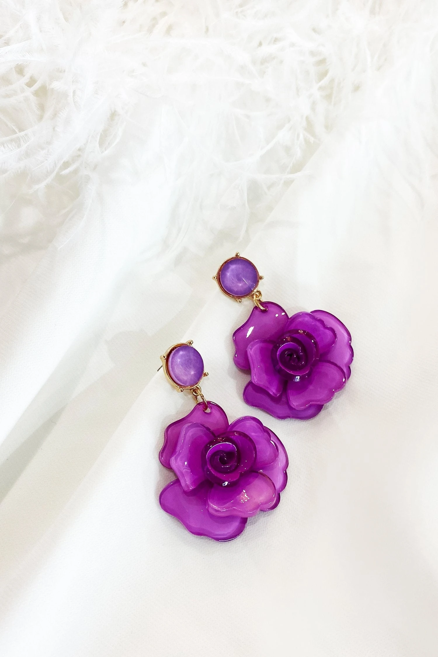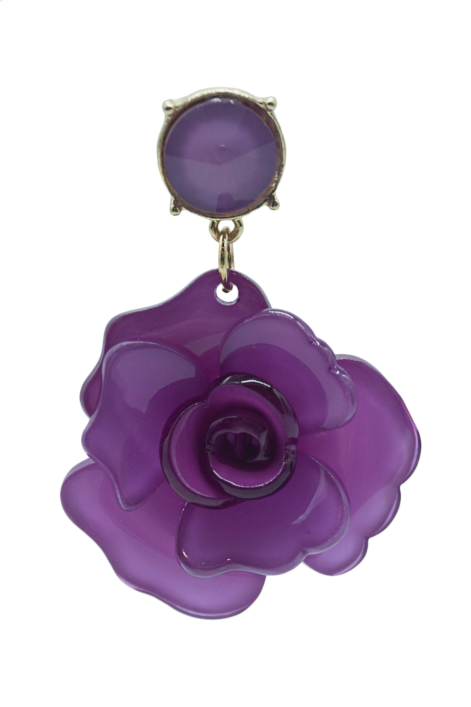 The Camilla Violet Acrylic Flower Earrings will be the perfect accessory for your resort wear. Featuring an acrylic flower with gold back hardware.Â