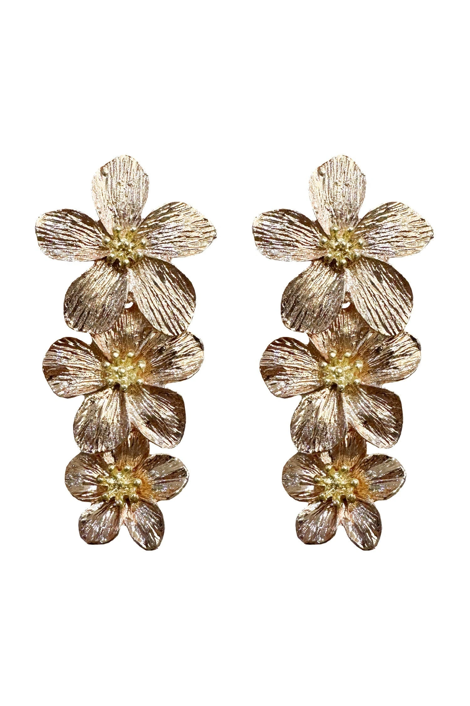 The Carola Rose Pink Flower Earrings are the perfect accessory to accentuate your look. This triple flower design with gold centers is a must-have.