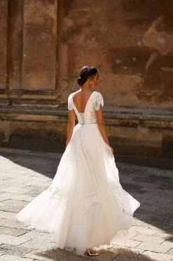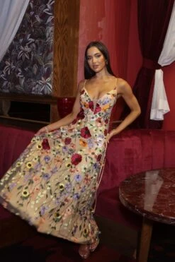 The stunning maxi dress you need. Cassie is made from silky white & blue print satin fabric and features an in-built bustier, long bishop style sleeves & a-line skirt.