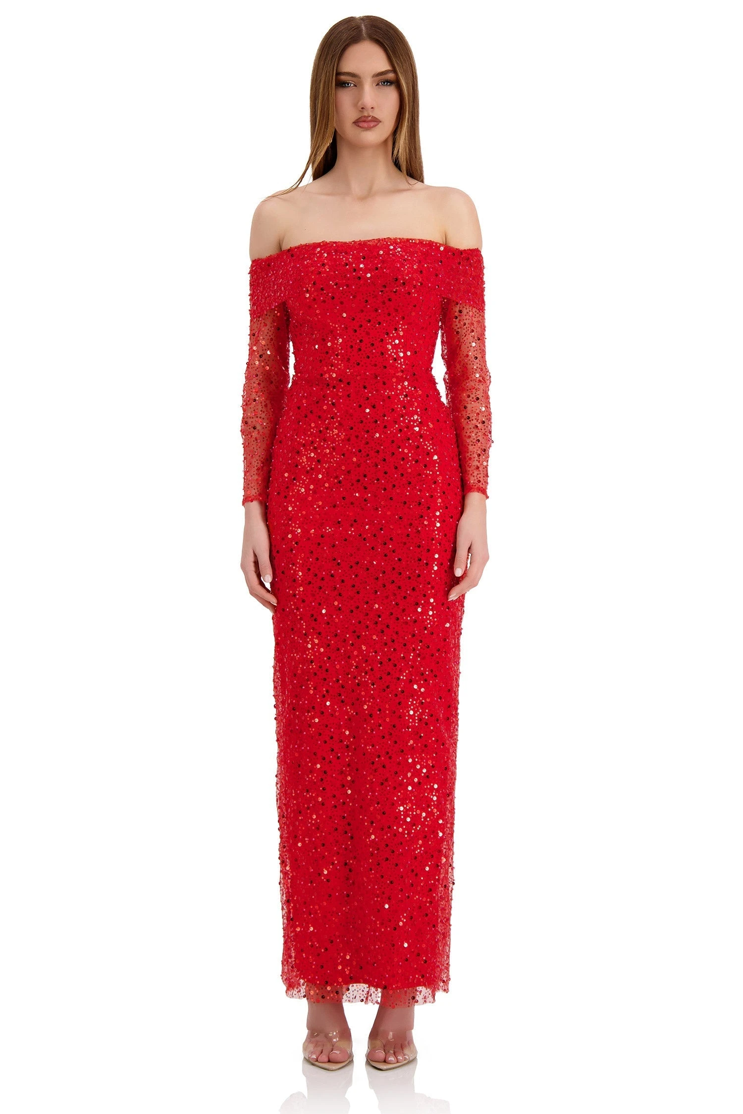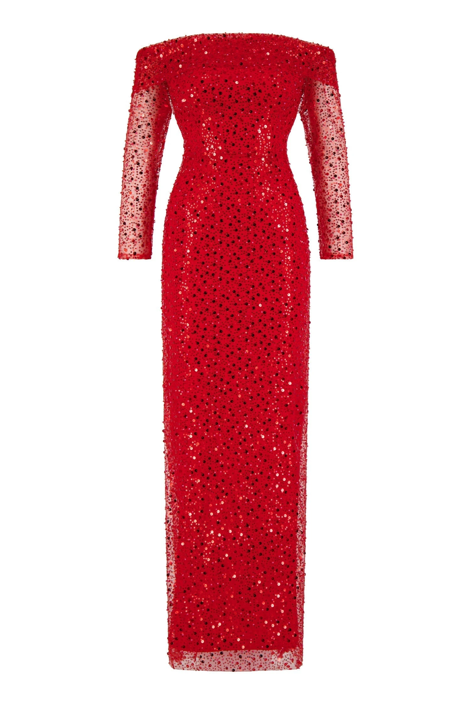 Modern and elegant, Damsel is a black-tie formal dress, best suitable for high-end events and night outs. Damsel is made from a delicate premium beaded and sequin fabric, lined with stretchy jersey fabric for a curve hugging fit. Damsel features a double folded off-shoulder neckline, sheer long sleeves and maxi length with a split at the back for easy movement. Shine at your next event in Damsel.