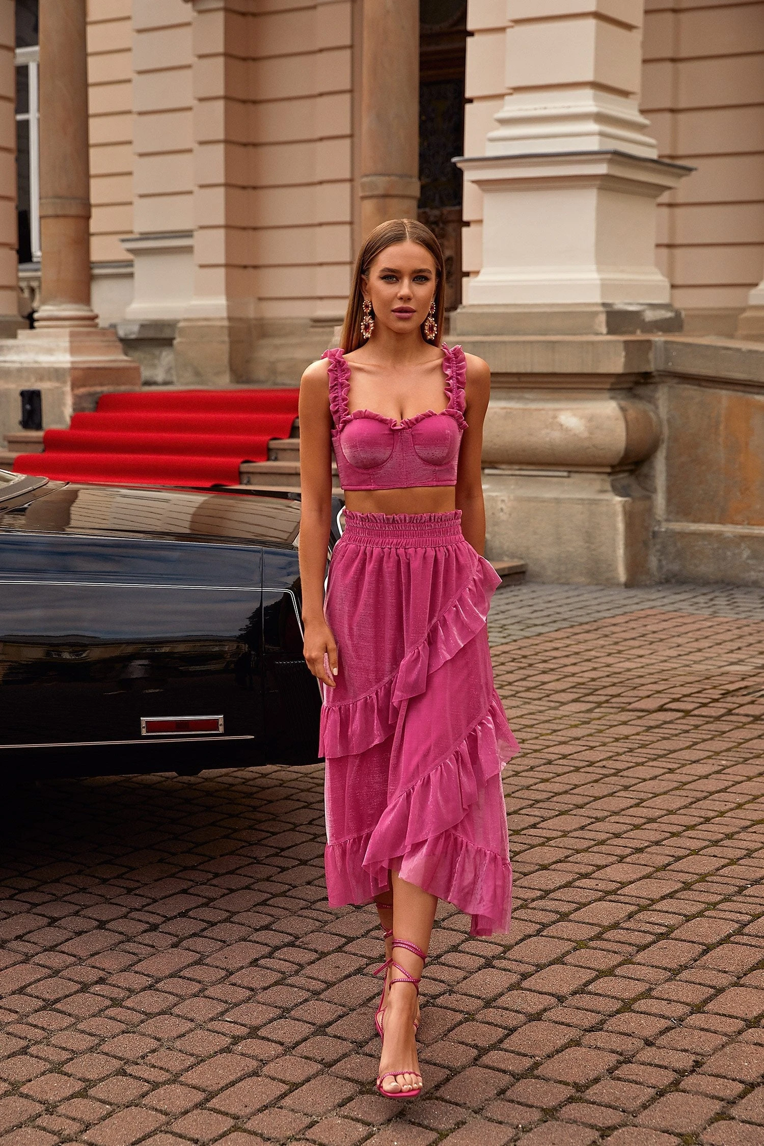 The Danielle Set has an abundance of feminine details that will elevate your event wear. Made from a light-catching mesh fabric in a hot pink hue, with ruffle detailing on the sleeves and formed with a flowing skirt. This two-piece set brings modernity and femininity together for a romantic aesthetic.