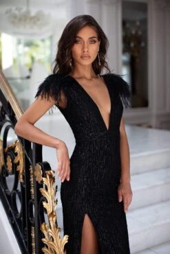 Fall in love with Elanur, the incredible new shimmering black gown that will turn heads at your prom. Be the envy of every girl with black glitter fabric all over, a plunge V-neck for a hint of sexy & faux fur shoulders. Made from stretchy fabric with mesh lining.