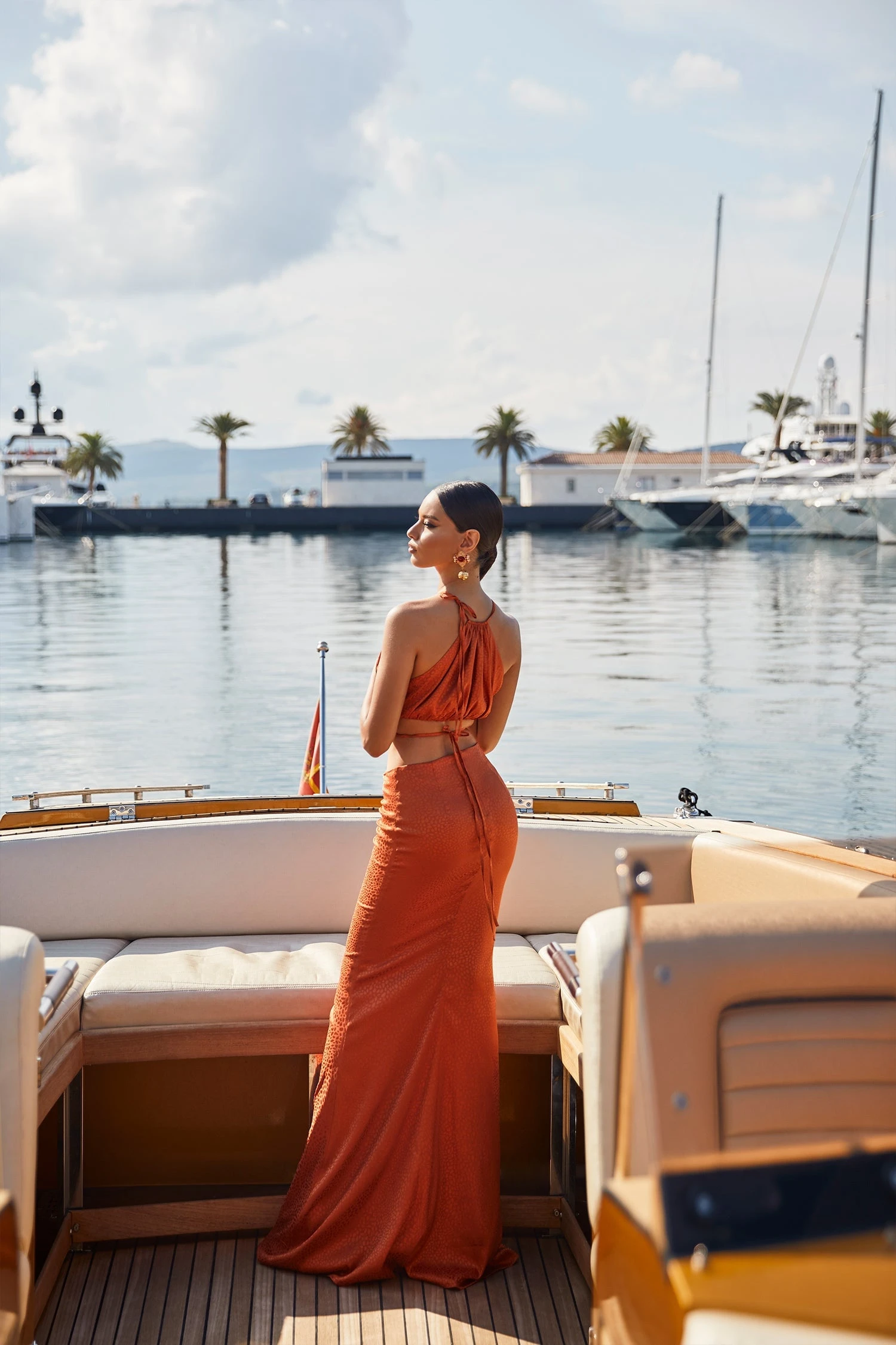 The Emilia Set provides a modern take on evening styling with its two-piece design, waist wrap, and v-shaped skirt. Rendered from an animalier textured satin in a rustic orange hue that hugs the hips and falls to a straight silhouette. The Emilia Set is the ultimate contemporary look.
