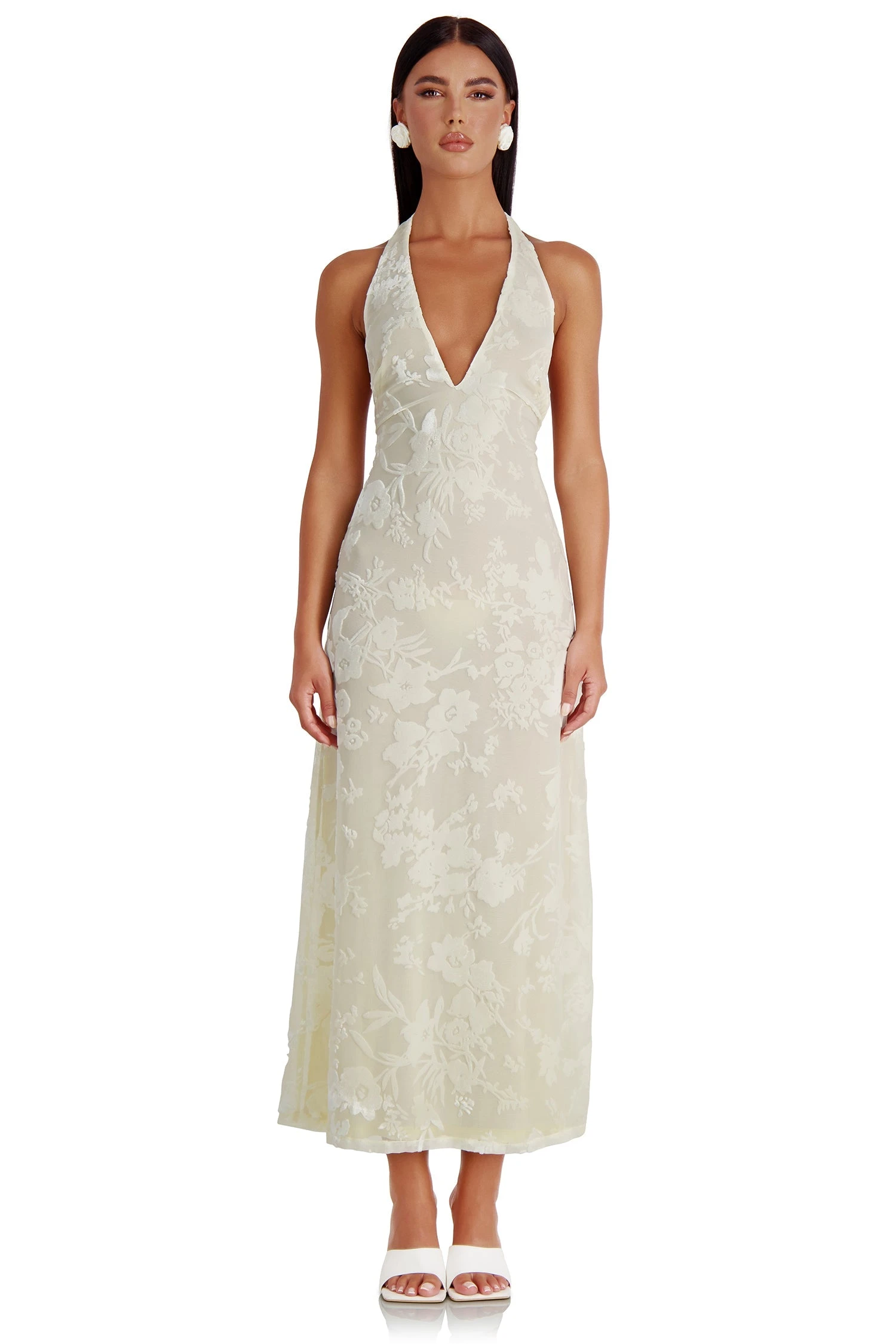 Presenting the Giordana Dress. With a plunging v-neckline, alluring halter design, and open back, this dress is the epitome of glamour. Crafted from luxurious velvet devoré fabric with a mesh lining, it boasts a fitted silhouette at a chic midi length. Elevate your style with this exclusive piece.