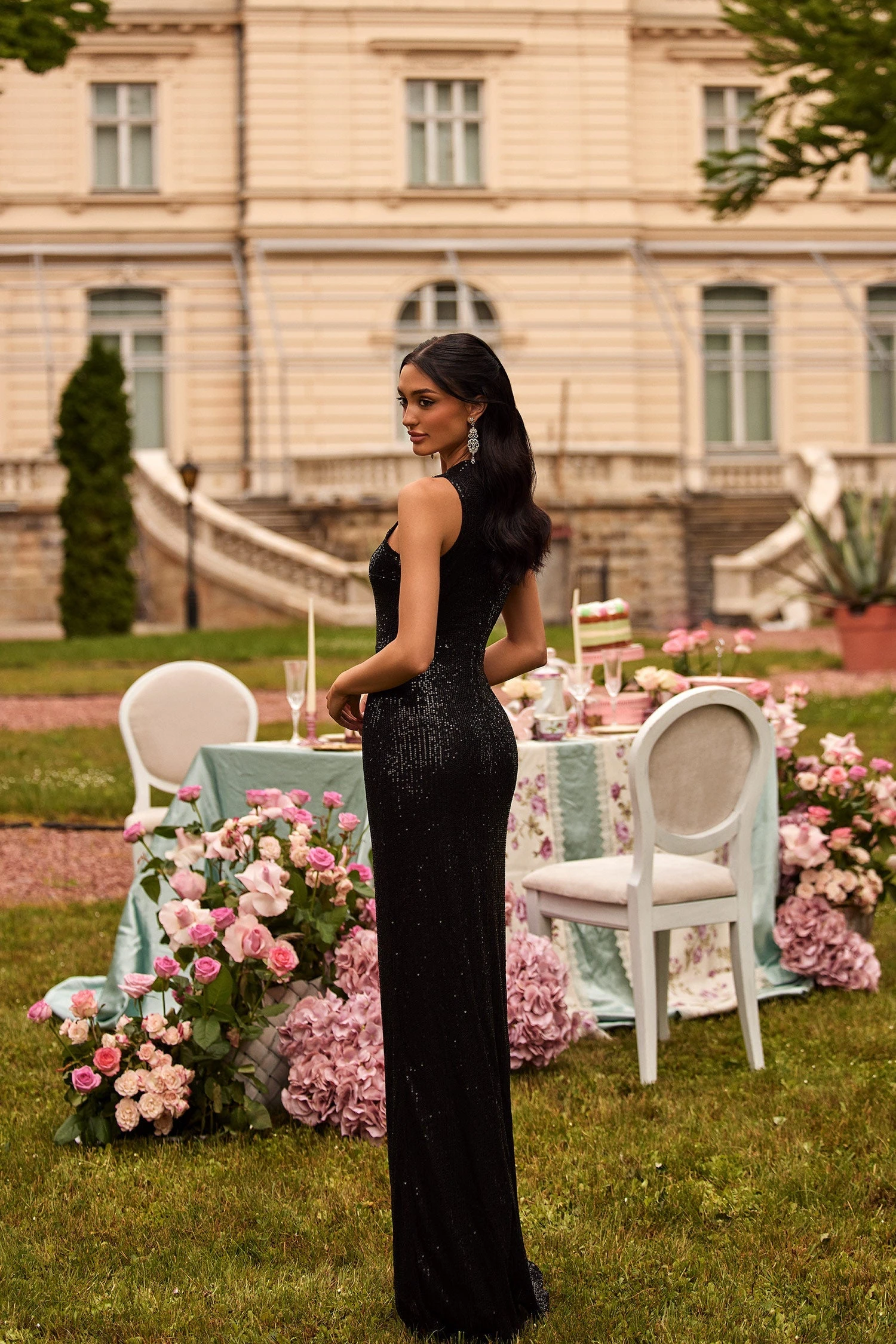 Rendered with light-catching sequins in a classic black tone, the Hailey Gown will elongate the figure with its formed fitting silhouette and side slit. Both modern and stylish, this dress is elevated with its racer neckline that features a unique diagonal cut-out that opens and closes to expose the bodice.