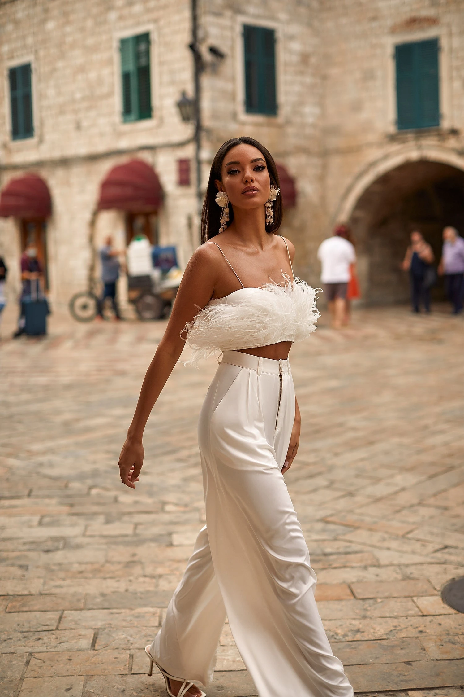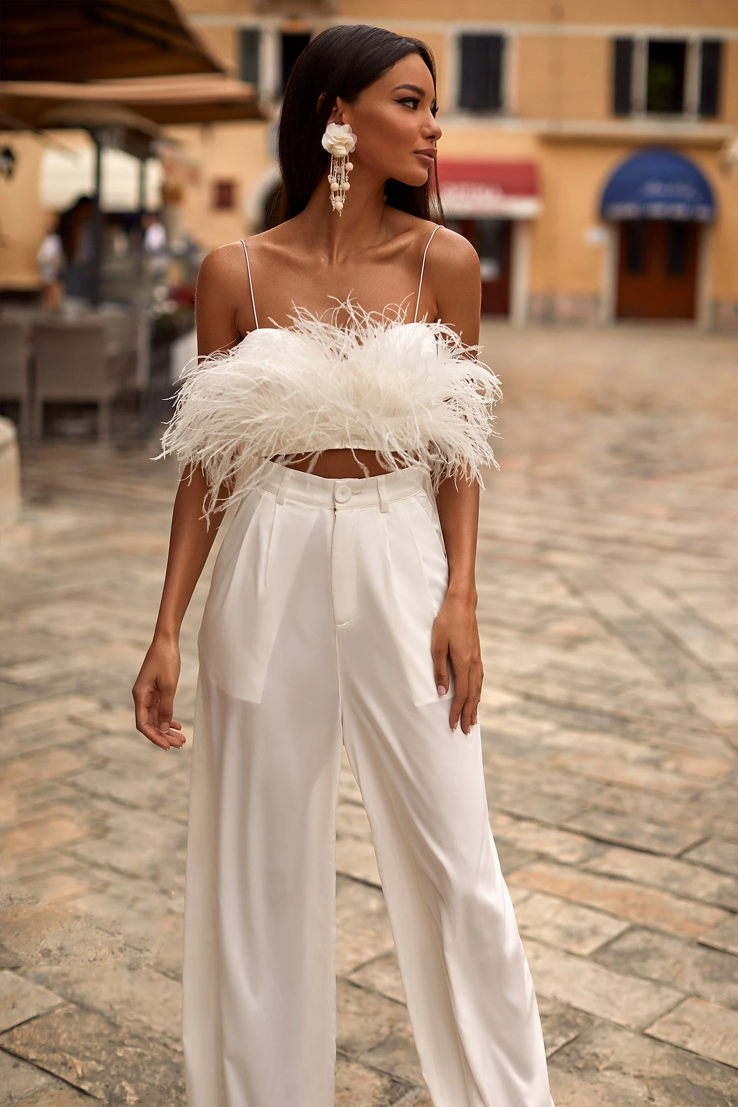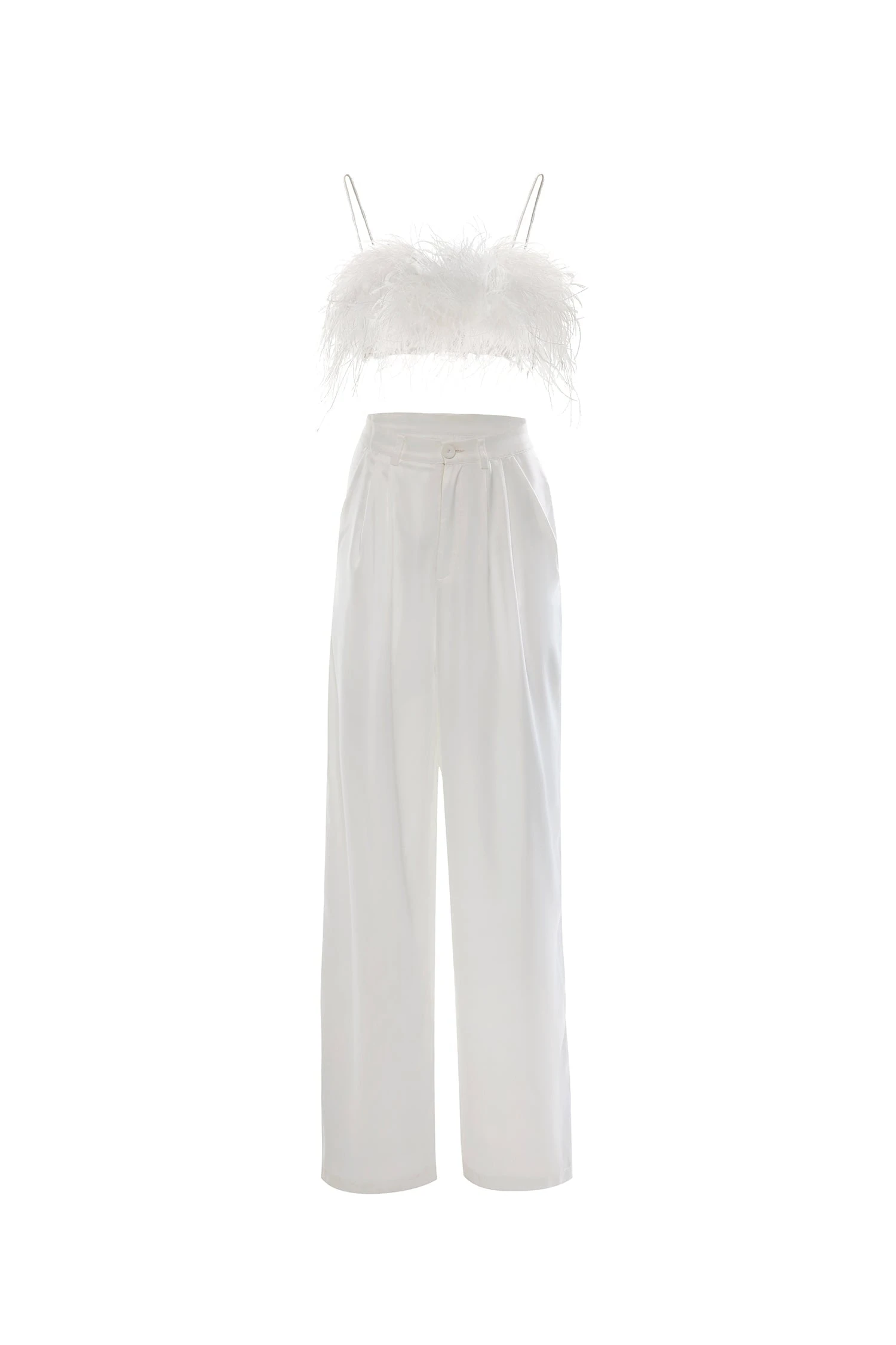 Modernise your style with the Hilma Set. Suspended from dainty straps, this feather crop is a season favourite. Paired with high-waisted palazzo-style pants, this set opts for a super chic look.Â