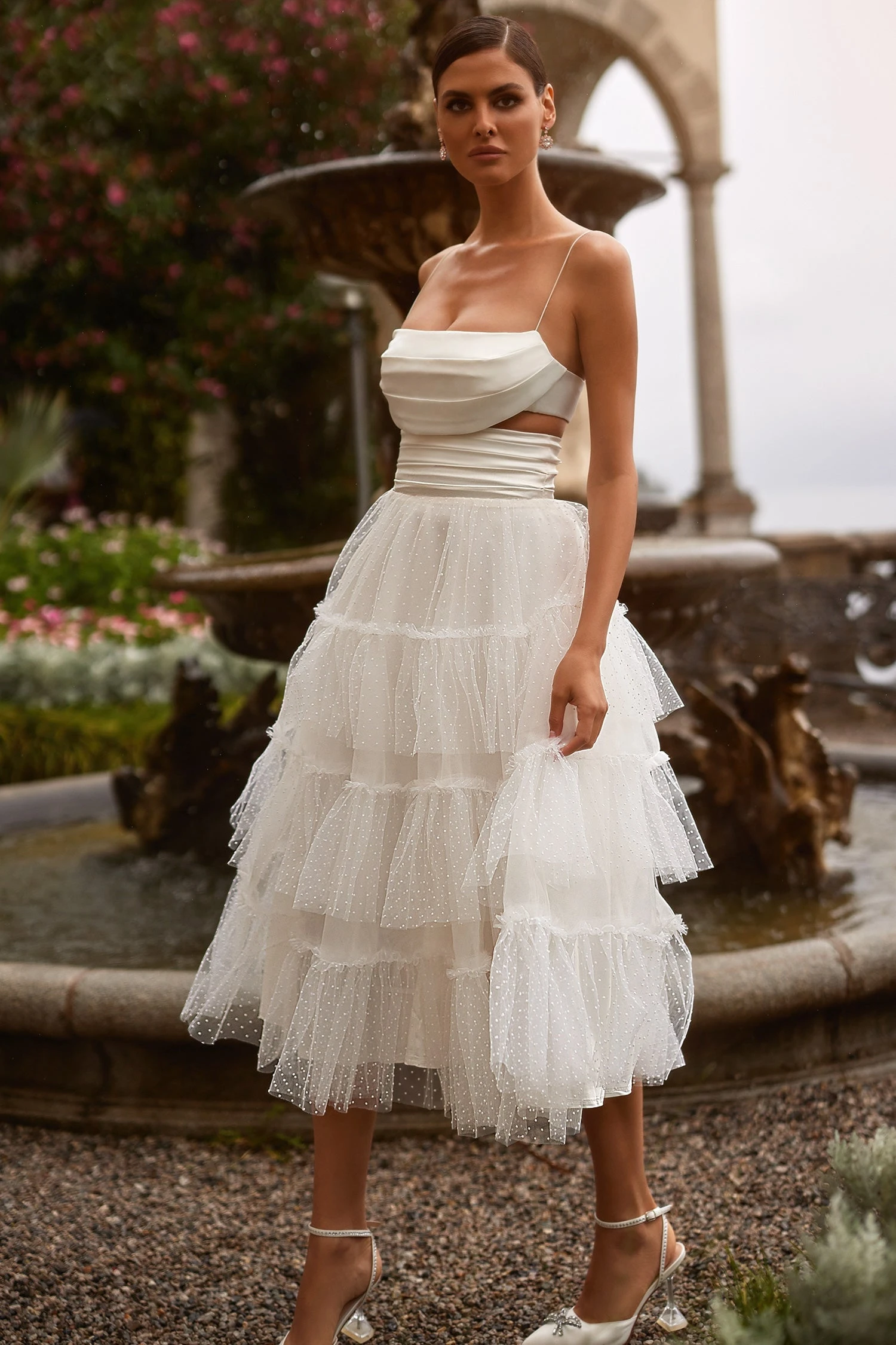 Embracing femininity, the Jessie Set is so graceful. Featuring a draped crop that is elevated by dainty straps, a pleated waistline at the skirt, and made in a soft satin fabric and polka dot mesh to elevate its a-line silhouette. The Jessie Set is a glamorous look for your luxury events.