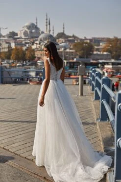 San Gallo lace fabric, non-stretch, elastic back, button clasp back, adjustable straps, elastic off-shoulder sleeves, heavy fabric, lined, unlined off-shoulder sleeves