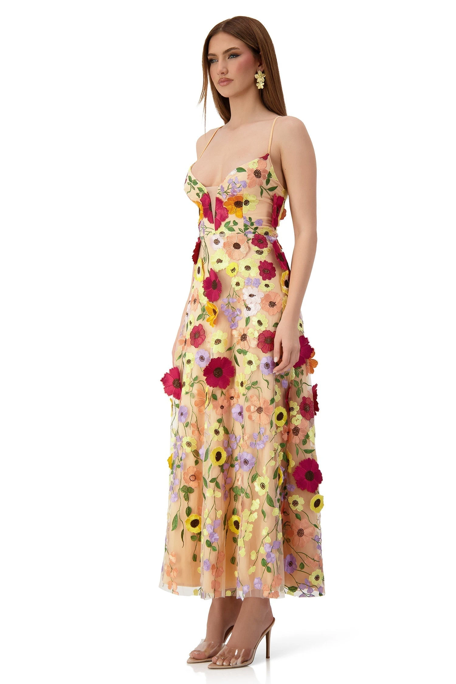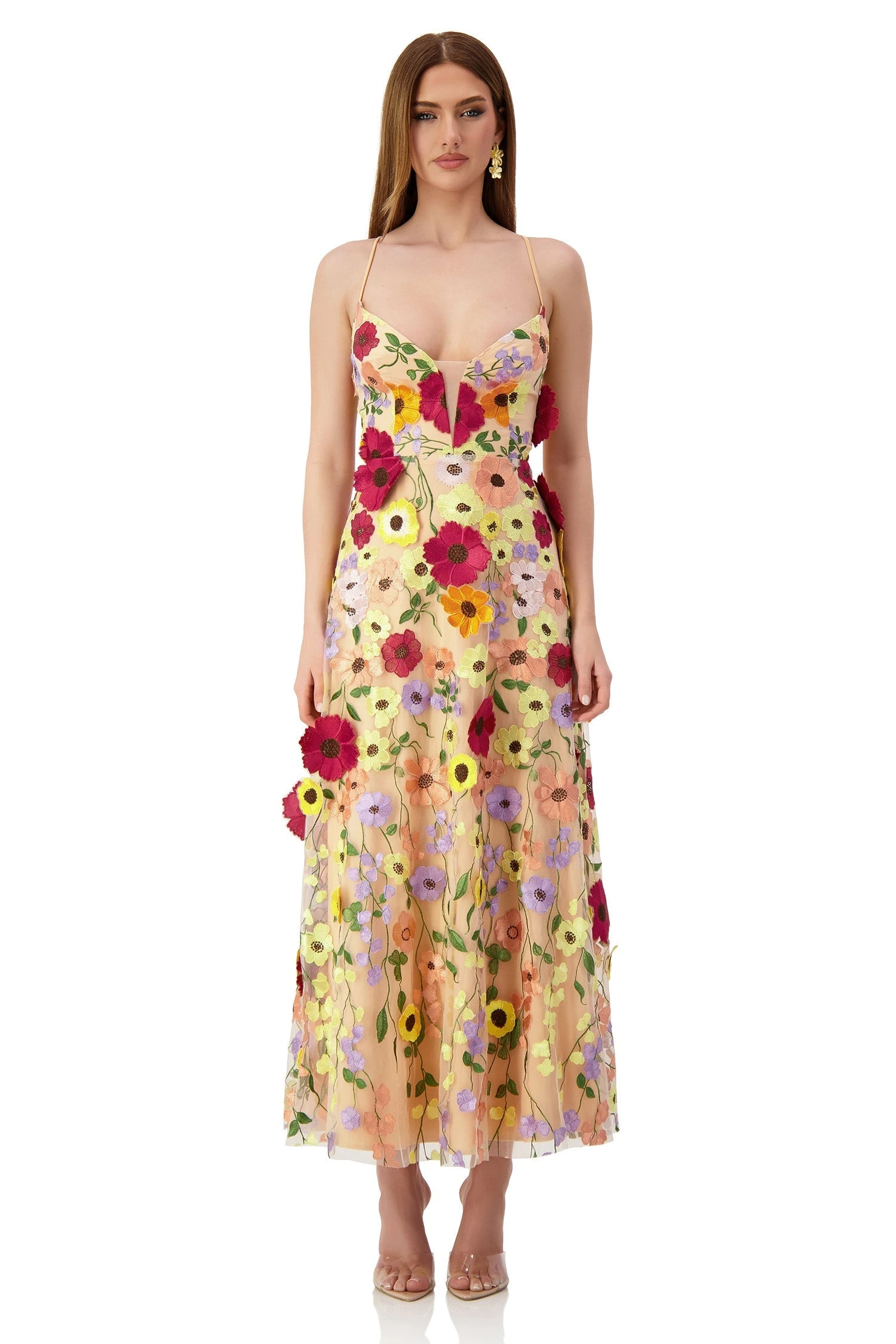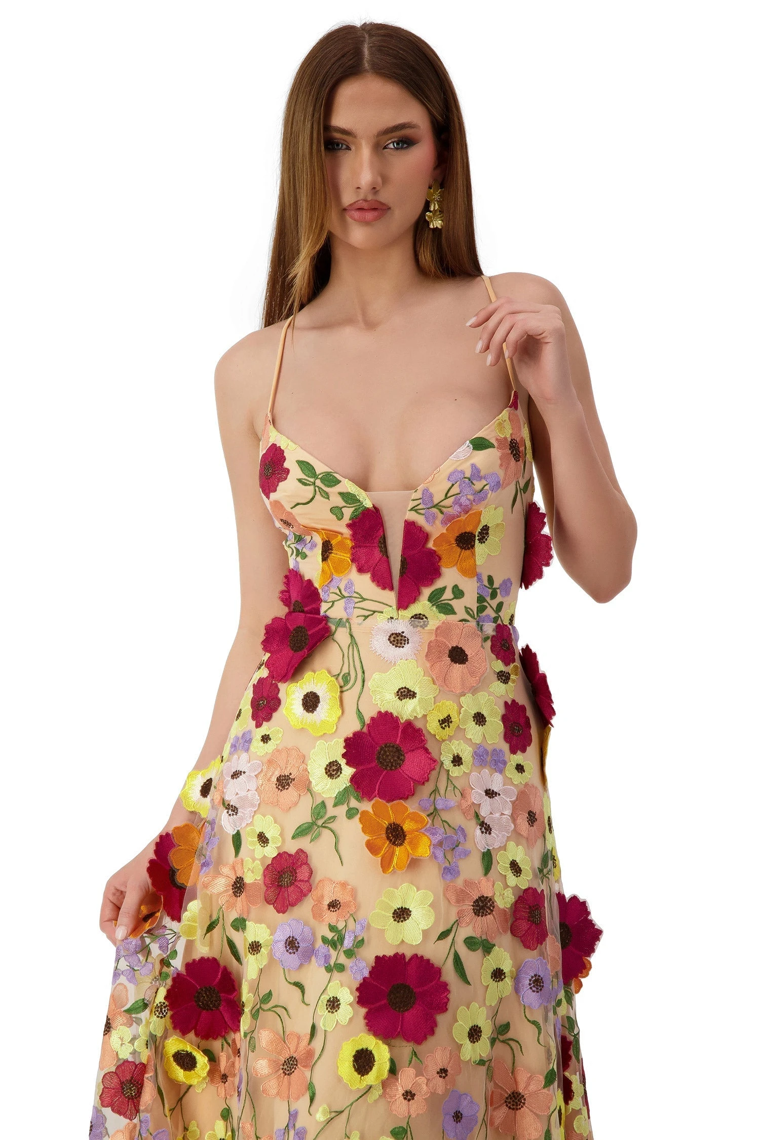 For the floral lovers, Lucy is made from our floral 3D fabric which is super chic, flirty and feminine. Inspired by our Odette Dress, Lucy features a v shaped neckline with mesh inserts, thin spaghetti straps and lace up back. Lucy has a beautiful flowy silhouette that makes the dress super comfortable to wear at any event.Â