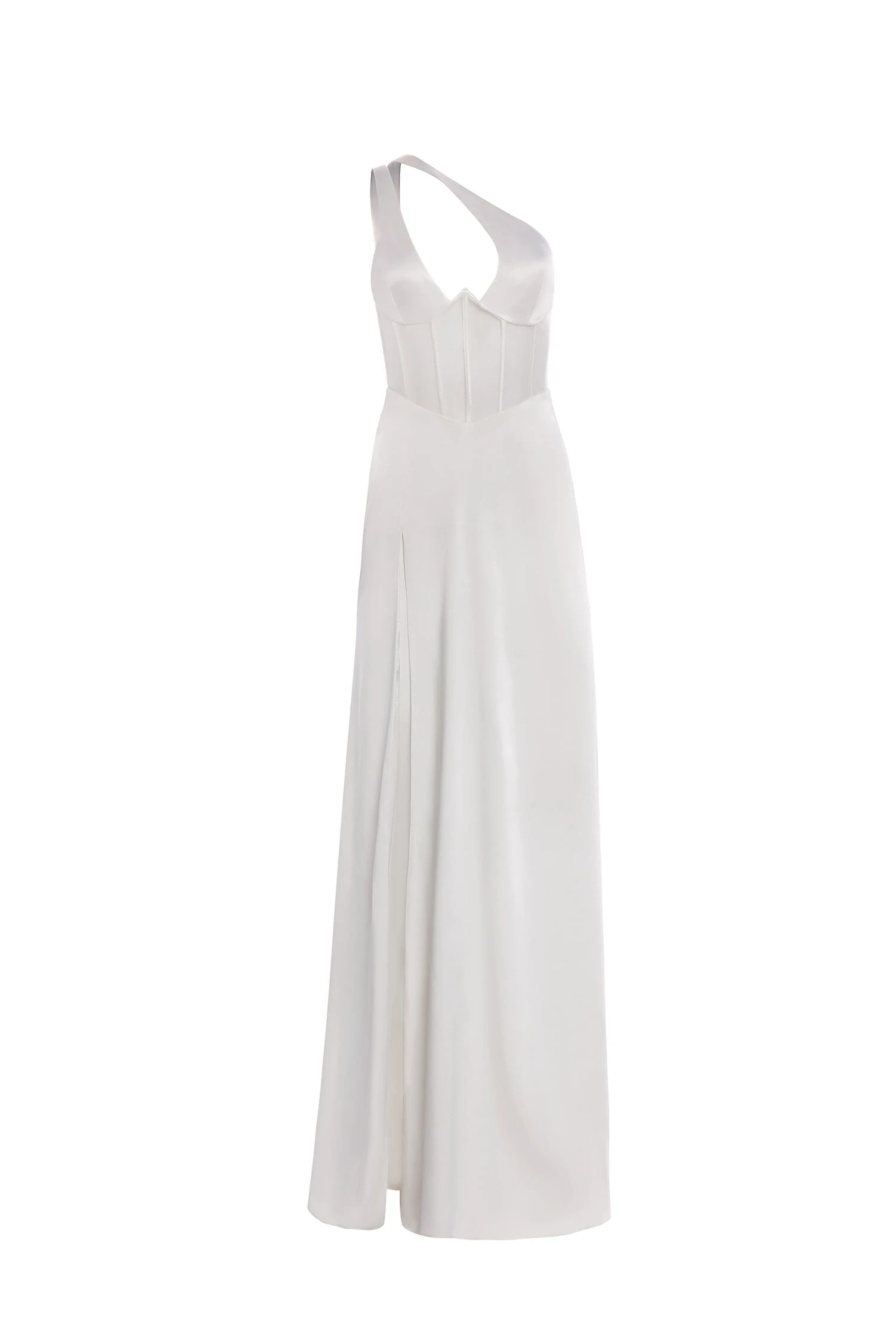 Satin fabric, mesh bodice with boning, stretchy skirt, no cups, non-adjustable straps, lined, right leg thigh-high slit, right shoulder sleeve, zip back.