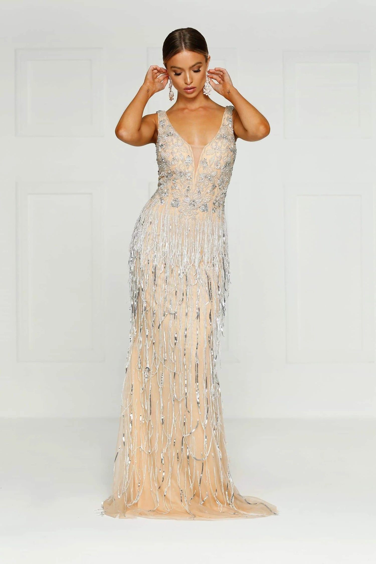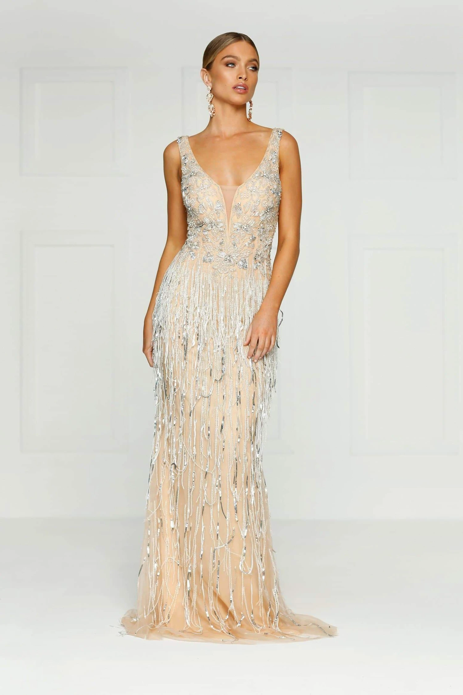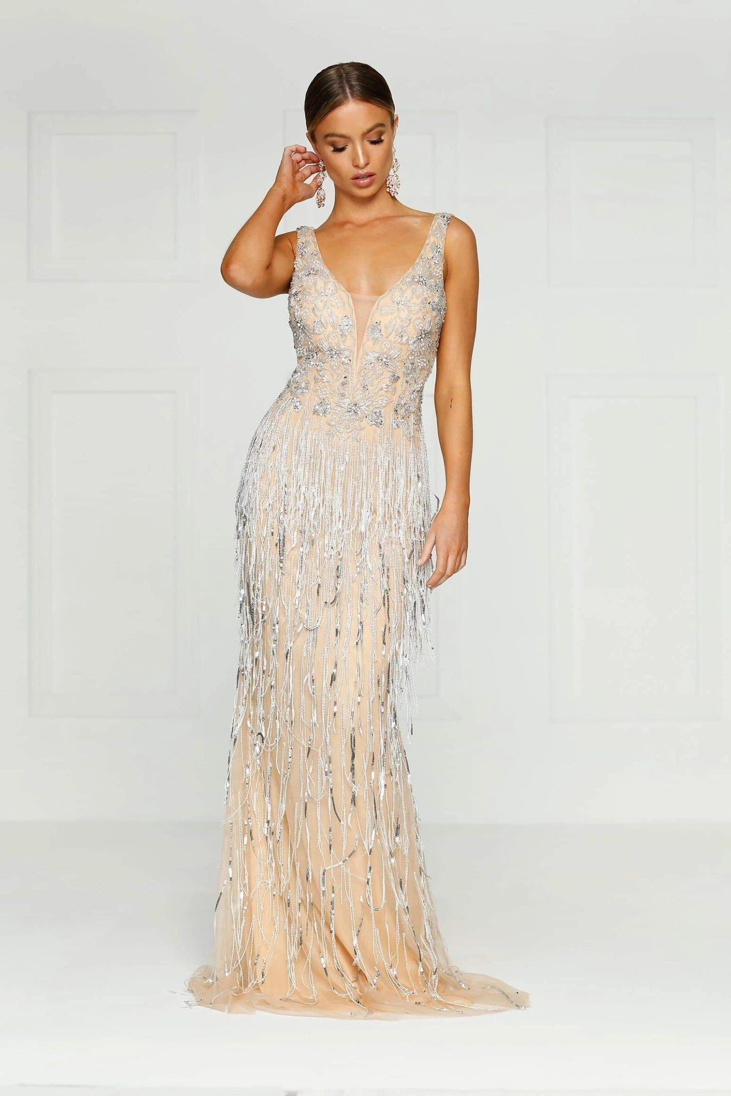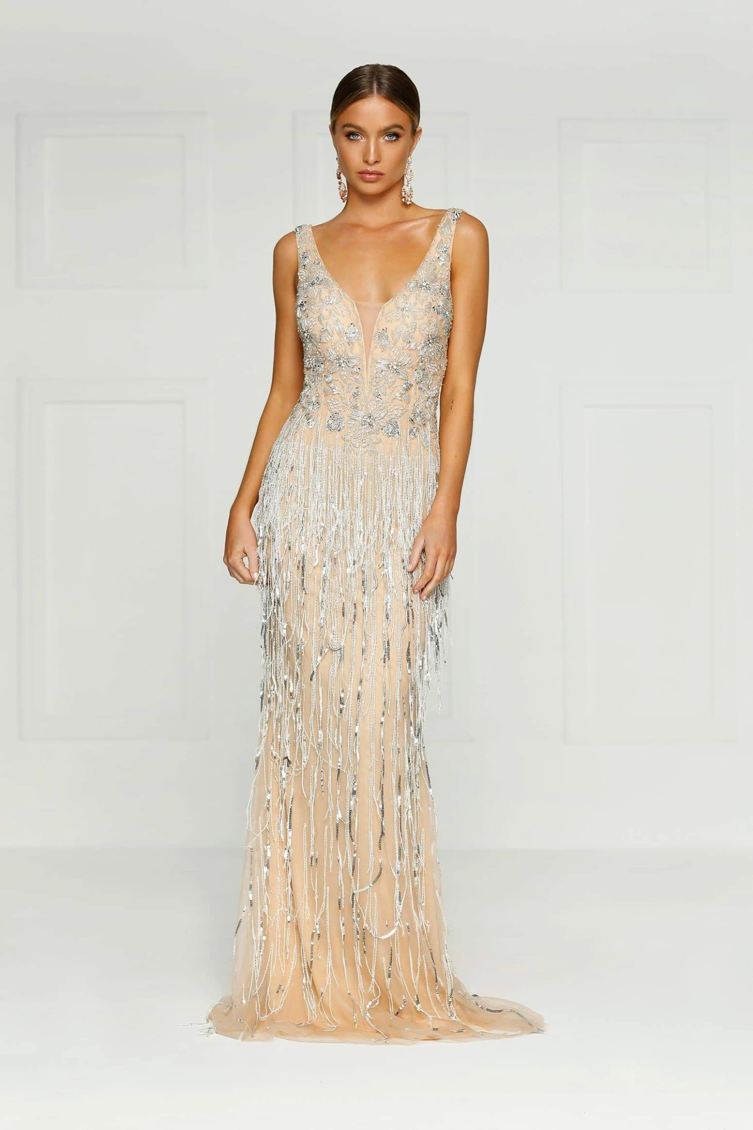 We are so thrilled to introduce our first hand beaded couture garment. This sleeveless dress has a v neckline with rich beading which creates the ultimate shine throughout. The bodice is fitted and moves into a flared skirt. This gown is full length.