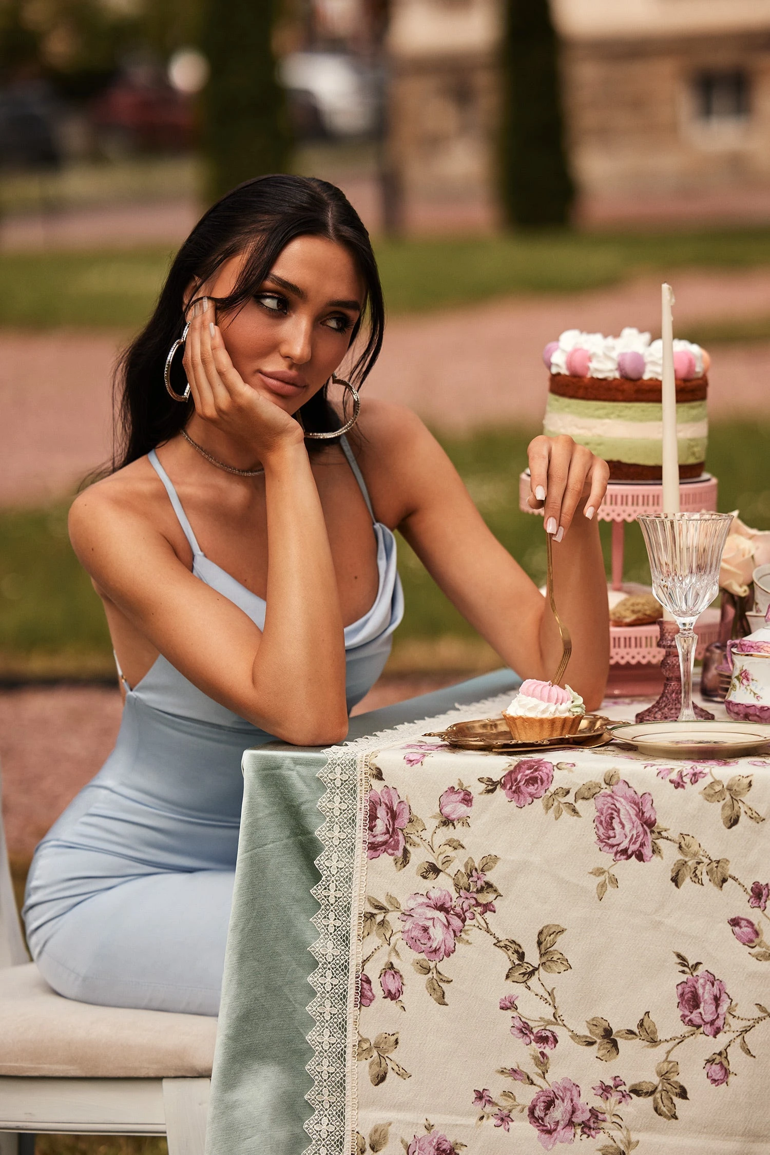 The Salou Gown is the epitome of effortless. Designed with a cowl neckline, a criss cross back, and a fitted mermaid silhouette. Made from a soft matte satin in a baby blue tone. The Salou Gown allows all the attention to be on you be enhancing your best features.