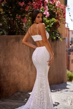 Tyra, the epitome of style & sophistication, made from beautiful star patterned glitter fabric to ensure all eyes are on you at your special event. Tyra features a high choker neckline with an absolutely incredible sparkling cape, mermaid silhouette & train. Feel like a million dollars and make the ultimate on-trend statement in this beautiful gown. Also fully lined.